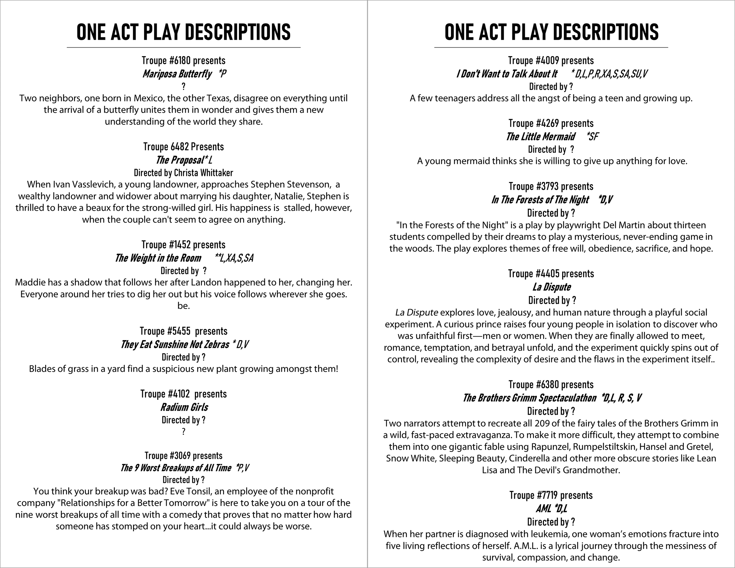 Six programs for each presented play should be provided by the troupe. These programs will be collected at the Stage Manager/Directors’ meeting. Additional programs may be made available to the audience at the troupe’s discretion.